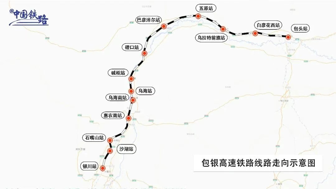 包銀高鐵起自包頭站,經(jīng)內(nèi)蒙古自治區(qū)包頭市、巴彥淖爾市、鄂爾多斯市、烏海市,寧夏回族自治區(qū)石嘴山市、銀川市,接入銀川站,正線全長519公里,設計時速250公里,實行分段建設,其中,惠農(nóng)至銀川段全長97公里,已于2024年10月開通運營,此次開通的包頭至惠農(nóng)段全長422公里,共設10座車站。