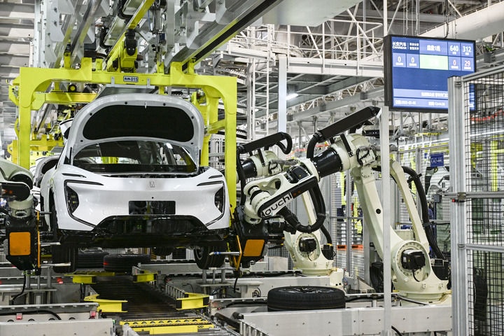 2025年3月6日在位于重慶的長安汽車數(shù)智工廠總裝車間拍攝的自動(dòng)化生產(chǎn)作業(yè)現(xiàn)場。新華社記者 王全超 攝