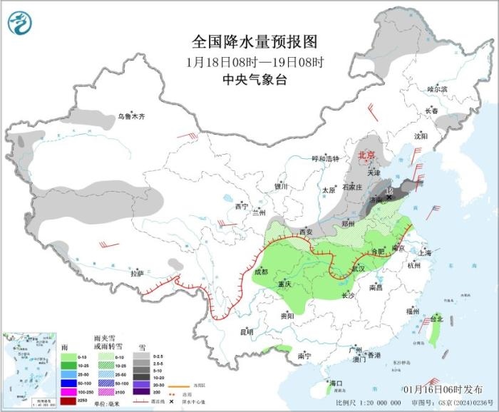 圖1 全國降水量預(yù)報圖(1月16日08時-17日08時)。圖片來源:中央氣象臺網(wǎng)站