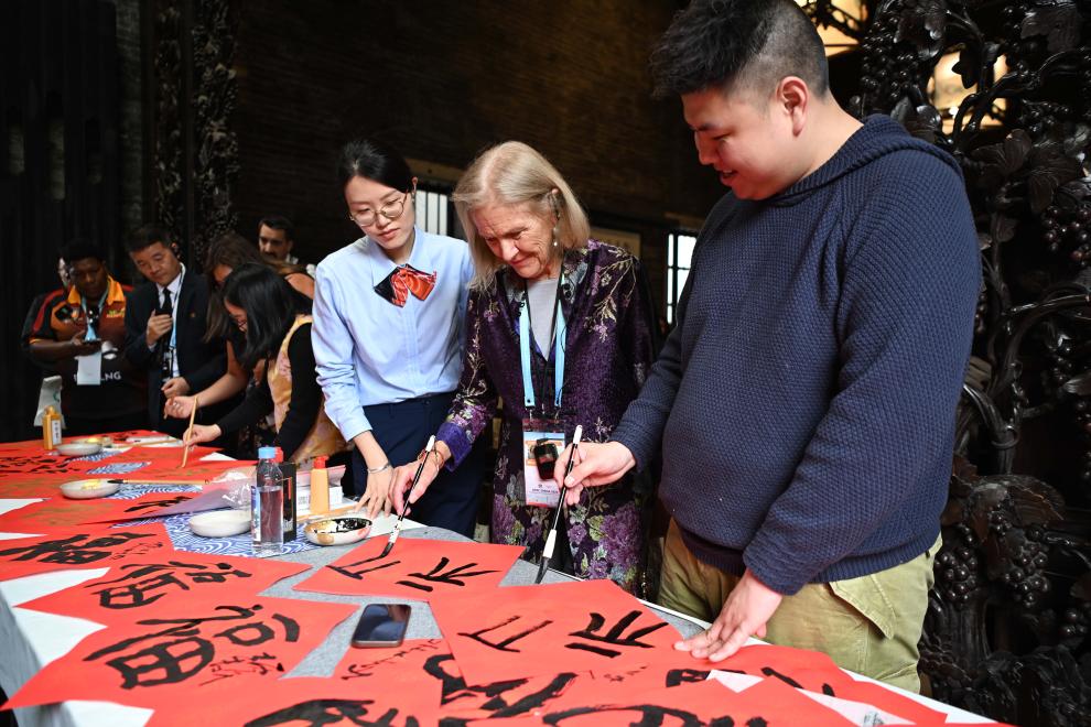 2月6日,亞太經(jīng)濟(jì)合作組織(APEC)2026年第一次高官會(huì)及相關(guān)會(huì)議的部分與會(huì)代表在廣州陳家祠體驗(yàn)中國(guó)書法。 新華社記者 鄧華 攝