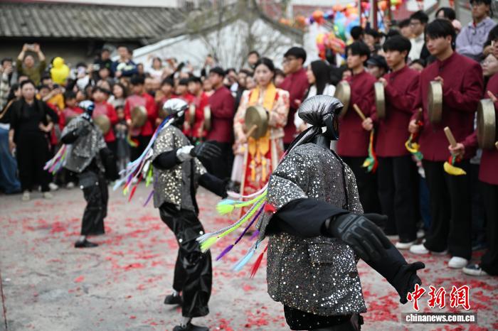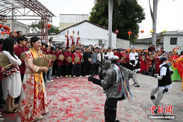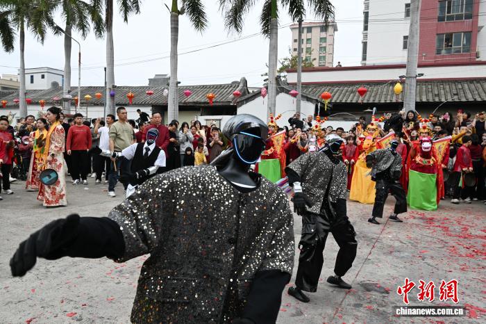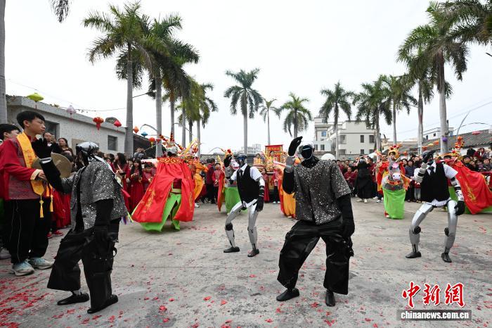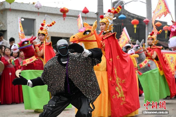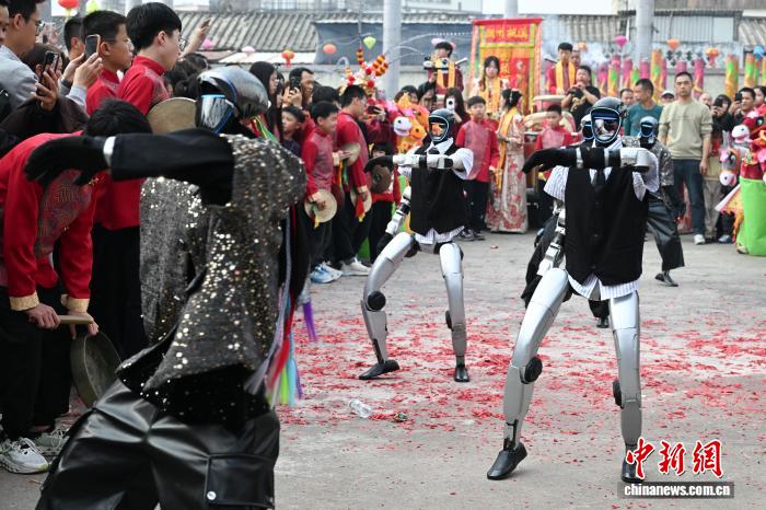 2月24日,廣東省潮州市田頭何村開(kāi)展民俗巡游活動(dòng),機(jī)器人與布馬舞舞者共舞,吸引村民觀看。中新社記者 陳楚紅 攝
