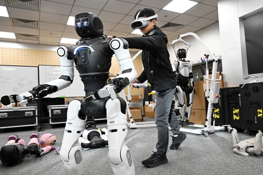 圖為由上海交通大學(xué)、上海人工智能研究院孵化的具身智能創(chuàng)業(yè)企業(yè),在豫園燈會(huì)中心廣場(chǎng)精心打造了一個(gè)未來感十足的智能互動(dòng)區(qū)。文匯報(bào)記者袁婧攝