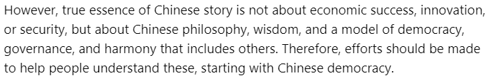文章稱,中國(guó)成功的基礎(chǔ)在于中國(guó)獨(dú)特的民主模式——全過程人民民主。其中,社會(huì)主義核心價(jià)值觀是整個(gè)體系的基石。中國(guó)以人為本的治理模式,以人民的福祉、安全和繁榮為核心,并通過全過程人民民主來實(shí)現(xiàn)。