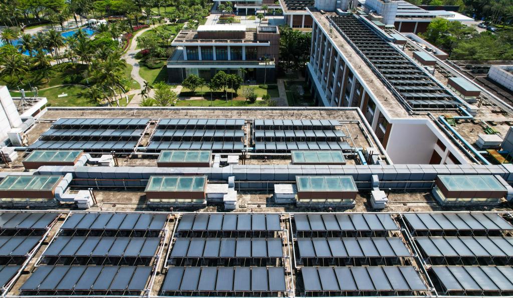 在博鰲零碳示范區(qū)拍攝的東嶼島大酒店屋頂?shù)墓夥O(shè)備(3月19日攝,無人機照片)。