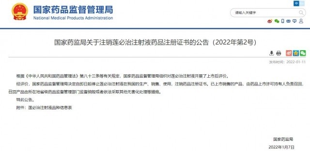 據(jù)國家藥監(jiān)局網(wǎng)站消息,國家藥品監(jiān)督管理局11日發(fā)布公告,決定自即日起停止蓮必治注射液在我國的生產(chǎn)、銷售、使用,注銷藥品注冊證書。已上市銷售的產(chǎn)品,由藥品上市許可持有人負(fù)責(zé)召回,召回產(chǎn)品由所在地省級(jí)藥品監(jiān)督管理部門監(jiān)督銷毀或者依法采取其他無害化處理等措施。
