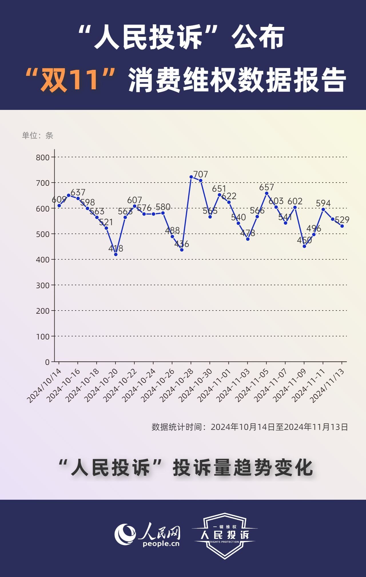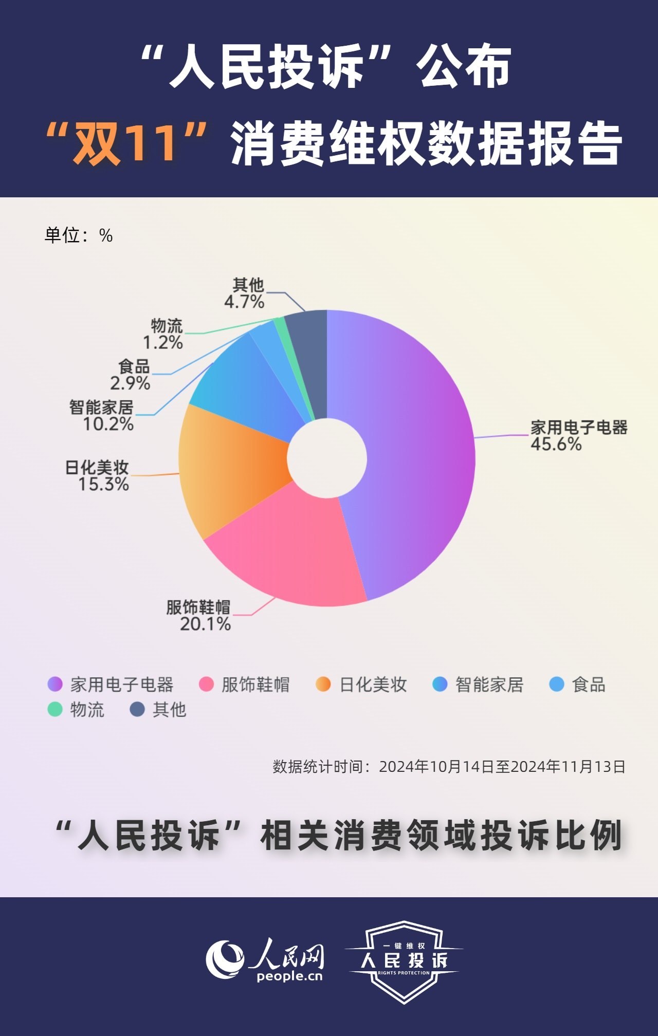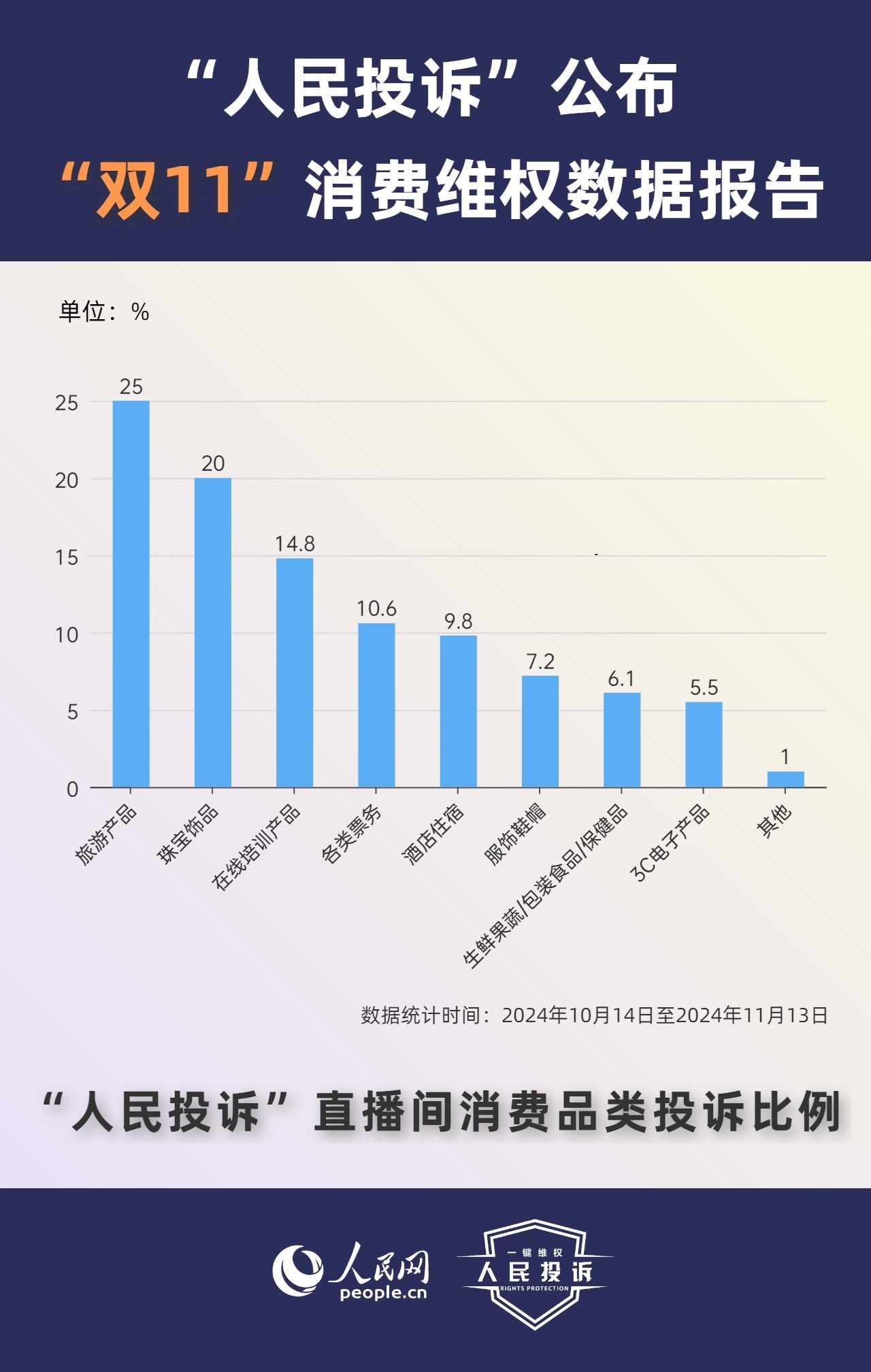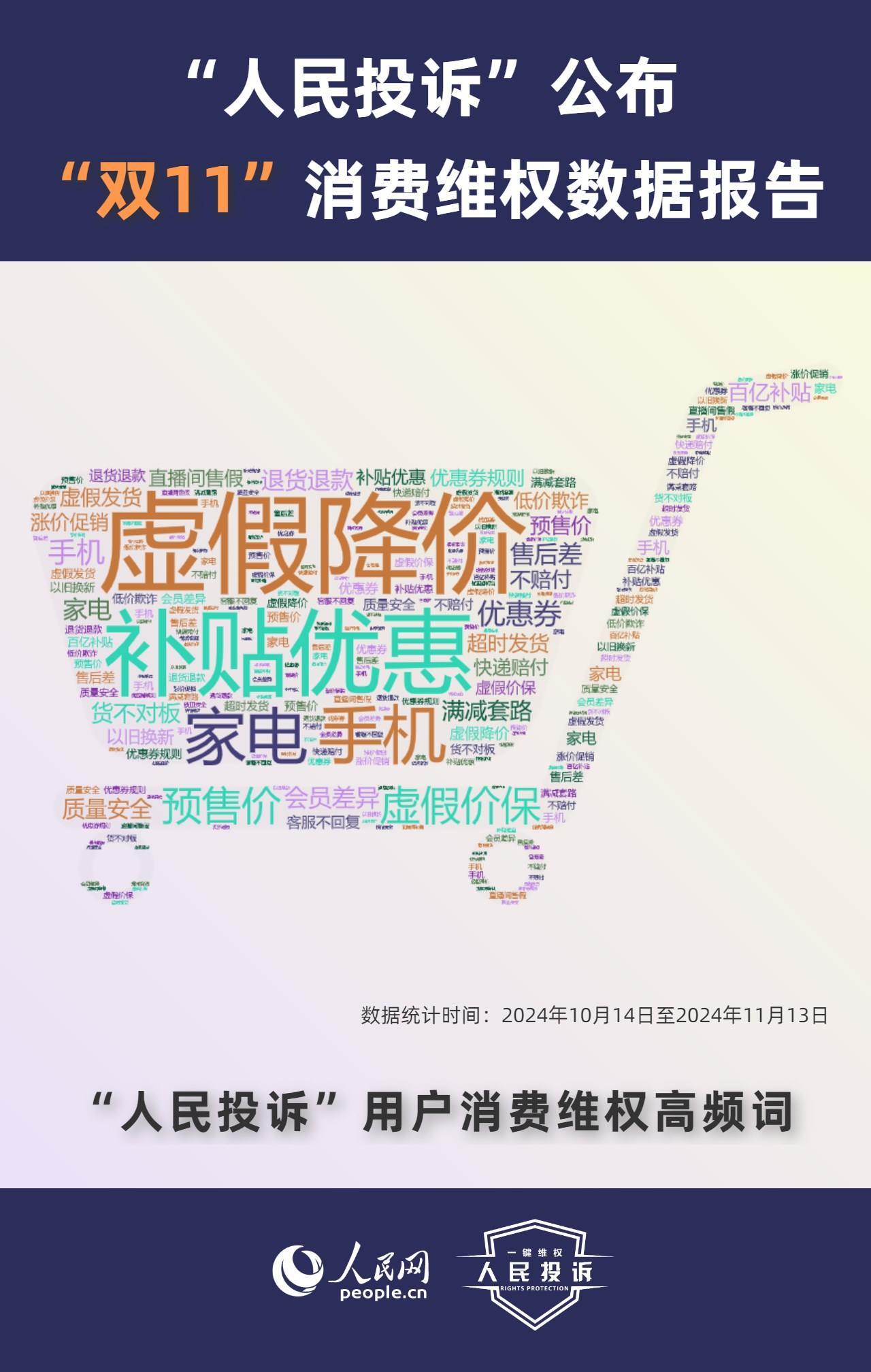 那么,今年你的“雙11”購物還遇到了哪些“套路”?據人民網“人民投訴”平臺統計,“雙11”期間平臺共收到17699條(數據統計從2024年10月14日-11月13日)投訴信息。其中,手機、家電、智能產品、美妝服飾等消費領域維權量大;平臺“國補”“以舊換新”等優(yōu)惠規(guī)則不透明,保價服務藏“貓膩”,直播間虛假“破價”,“百億補貼”商品貨不對板,“高價預售”欺詐等問題反映突出。