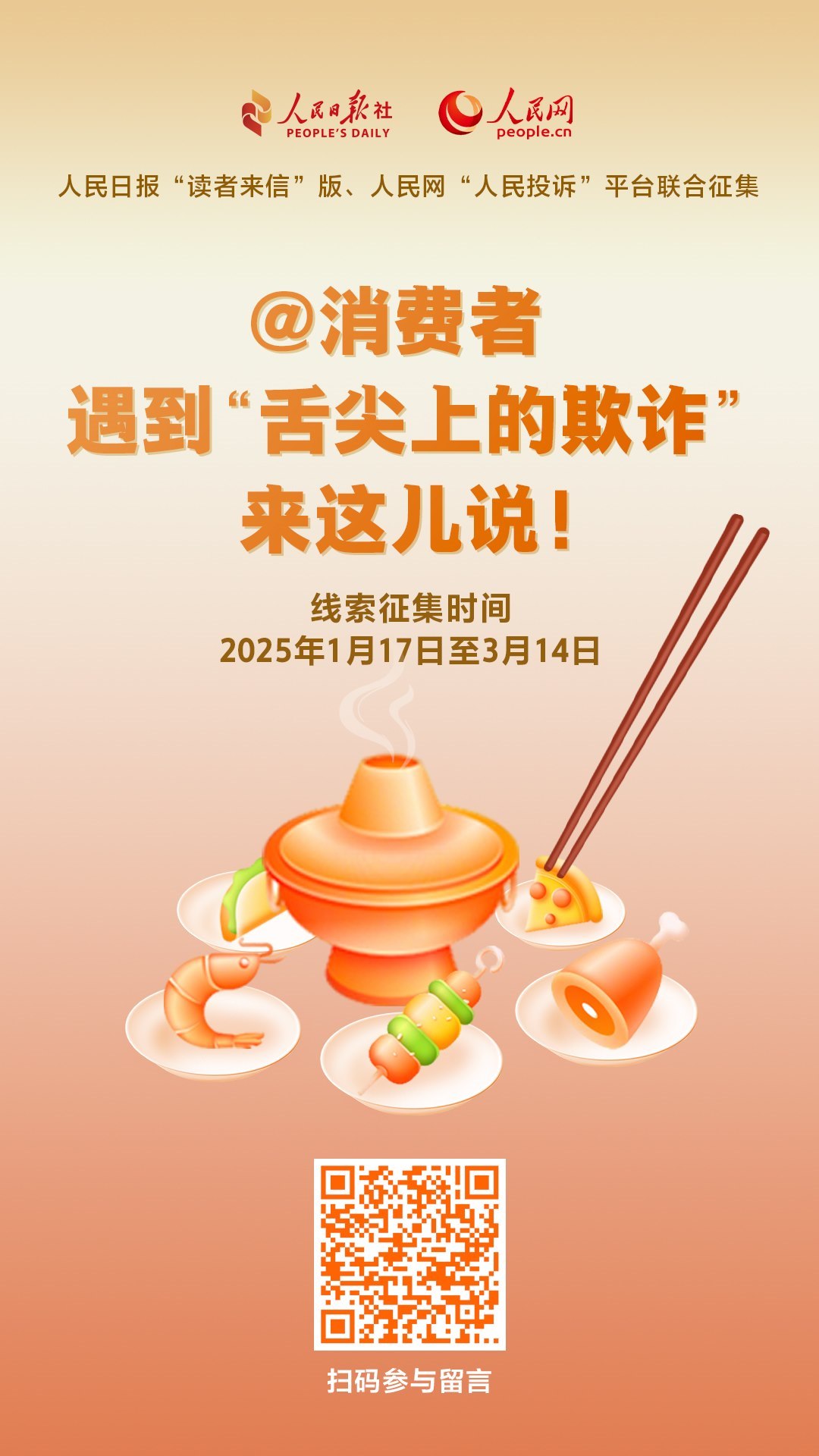牛肉干里不含牛肉,無(wú)糖產(chǎn)品其實(shí)含糖,配料表造假、營(yíng)養(yǎng)成分表不準(zhǔn)確……你遇到過(guò)嗎?“以假亂真”“以次充好”為代表的食品欺詐,嚴(yán)重?fù)p害消費(fèi)者利益,擾亂市場(chǎng)公平競(jìng)爭(zhēng)秩序。為筑牢食品安全防線,增強(qiáng)消費(fèi)者信心,即日起,人民日?qǐng)?bào)“讀者來(lái)信”版與人民網(wǎng)“人民投訴”平臺(tái)聯(lián)合發(fā)起相關(guān)線索征集,歡迎您掃描上方海報(bào)二維碼進(jìn)入征集頁(yè)面留言或提供調(diào)查線索至人民日?qǐng)?bào)“讀者來(lái)信”版(郵箱:dzlx@peopledaily.cn 傳真:010-65368495)。線索征集時(shí)間截至2025年3月14日。