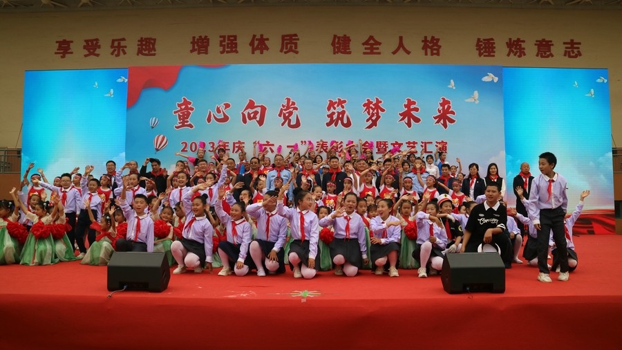 “少年時代是美好人生的前奏,是生命樂章的序曲,遠大抱負(fù)從這時萌生,高尚情操從這時孕育,良好品行從這時養(yǎng)成,過硬本領(lǐng)也從這時練就。希望所有同學(xué)要懂得感恩自己的父母,要聆聽老師的教導(dǎo),要遵守學(xué)校的規(guī)章制度,時刻嚴(yán)格要求自己,做一個理想遠大、品行端莊、學(xué)習(xí)優(yōu)良、身心健康的好學(xué)生,努力成為建設(shè)偉大祖國、建設(shè)美麗家鄉(xiāng)的有用之才、棟梁之材?!焙艉秃铺厥械谒闹袑W(xué)分校副校長陳平淵深情地向孩子們致以節(jié)日的問候和祝福,希望同學(xué)們度過一個健康、快樂、難忘的六一兒童節(jié)。