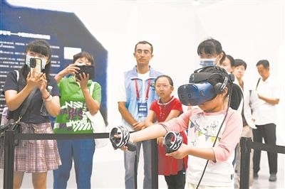 9月17日,在全國科普日北京主場活動展區(qū),小朋友使用虛擬現(xiàn)實設(shè)備感受天和核心艙內(nèi)的生活。新華社記者 鞠煥宗攝