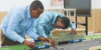在位于吉布提首都吉布提市的吉布提工商學校,學生在魯班工坊鐵道運營沙盤教學區(qū)學習。 新華社發(fā) |