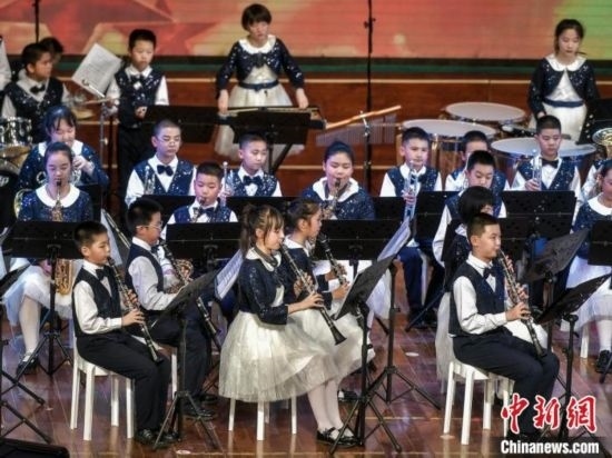 烏魯木齊市第27小學交響管樂團登臺獻藝。中新網記者 劉新 攝