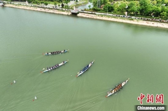 龍舟隊(duì)員們?cè)诤嫔细?jìng)技。(無(wú)人機(jī)照片)陳家樂(lè)攝
