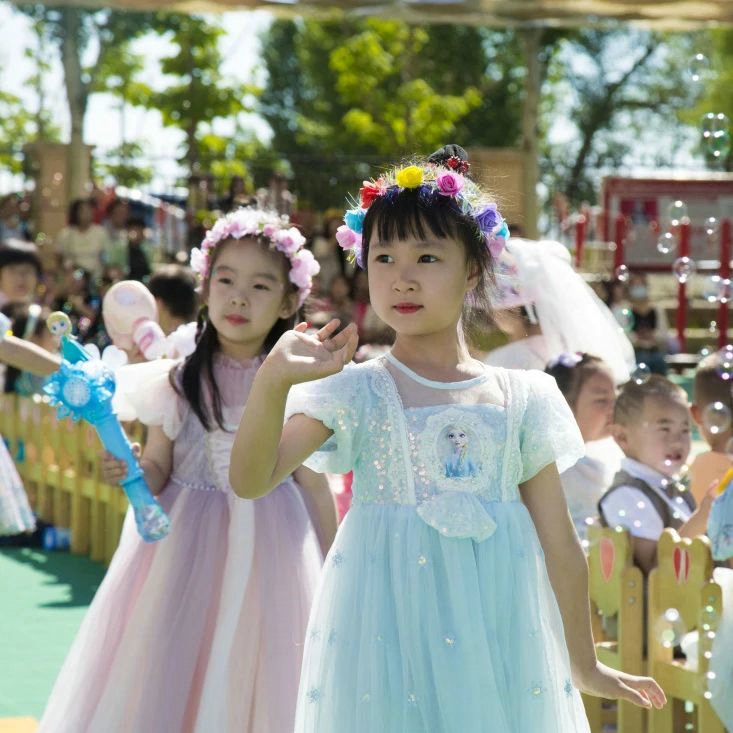 當(dāng)日,打扮成迪士尼童話里人物的老師們與盛裝打扮的小朋友們,共同手持泡泡機(jī),在晶瑩剔透的泡泡里一起沉浸在童話世界里。