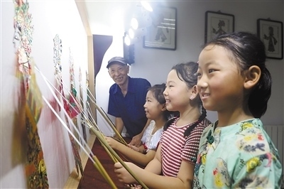 非遺體驗(yàn)河北省唐山市豐潤(rùn)區(qū)浭陽(yáng)街道華府社區(qū)開(kāi)設(shè)“非遺”小課堂,小朋友們?cè)趯W(xué)習(xí)表演皮影戲。 朱大勇攝(人民視覺(jué))