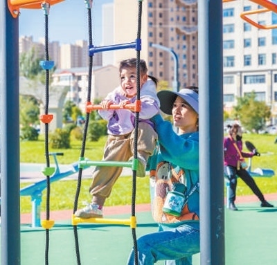 內(nèi)蒙古呼和浩特萬和體育公園,家長(zhǎng)幫助孩子攀爬軟梯。丁根厚攝(影像中國(guó))