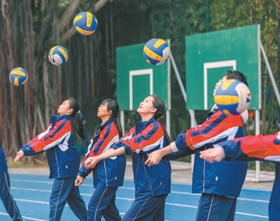 福建省福州市鼓樓區(qū)水部街道閩江學(xué)院附屬中學(xué),學(xué)生們?cè)谡n間練習(xí)排球。