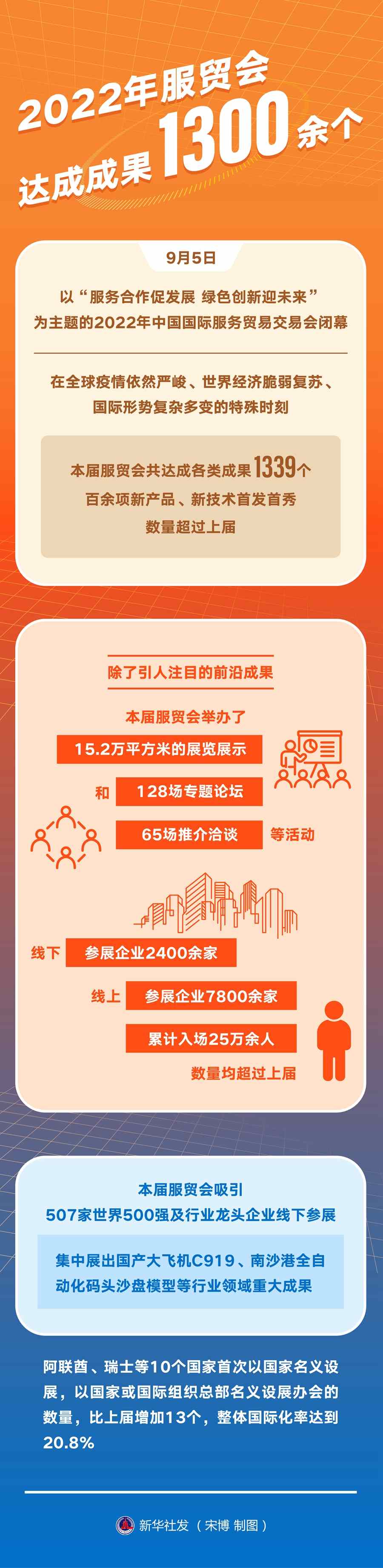9月5日,以“服務(wù)合作促發(fā)展綠色創(chuàng)新迎未來”為主題的2022年中國國際服務(wù)貿(mào)易交易會閉幕。在全球疫情依然嚴峻、世界經(jīng)濟脆弱復(fù)蘇、國際形勢復(fù)雜多變的特殊時刻,本屆服貿(mào)會共達成各類成果1339個,百余項新產(chǎn)品、新技術(shù)首發(fā)首秀,數(shù)量超過上屆。
