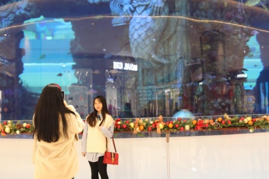 春節(jié)期間,顧客在重慶市江北區(qū)星光68廣場的室內(nèi)海洋館前拍照。新華社記者 周思宇 攝