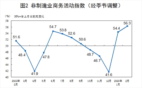 2月份,非制造業(yè)商務(wù)活動指數(shù)為56.3%,比上月上升1.9個百分點,連續(xù)兩個月位于景氣區(qū)間,非制造業(yè)恢復(fù)發(fā)展態(tài)勢向好。