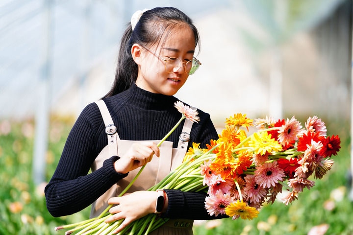 位于沂蒙革命老區(qū)的莒縣招賢鎮(zhèn)扶郎花生產基地,工作人員在整理扶郎花。
