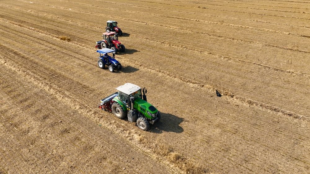 樂陵市來秋農機服務專業(yè)合作社的四臺新式追肥機正在麥田進行追肥作業(yè)。