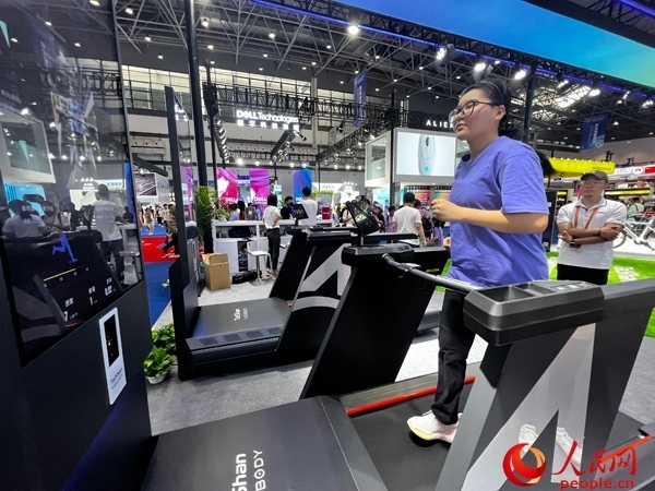 觀眾在消博會現(xiàn)場體驗3D智能專業(yè)跑步機(jī)。人民網(wǎng)記者 張力洋攝