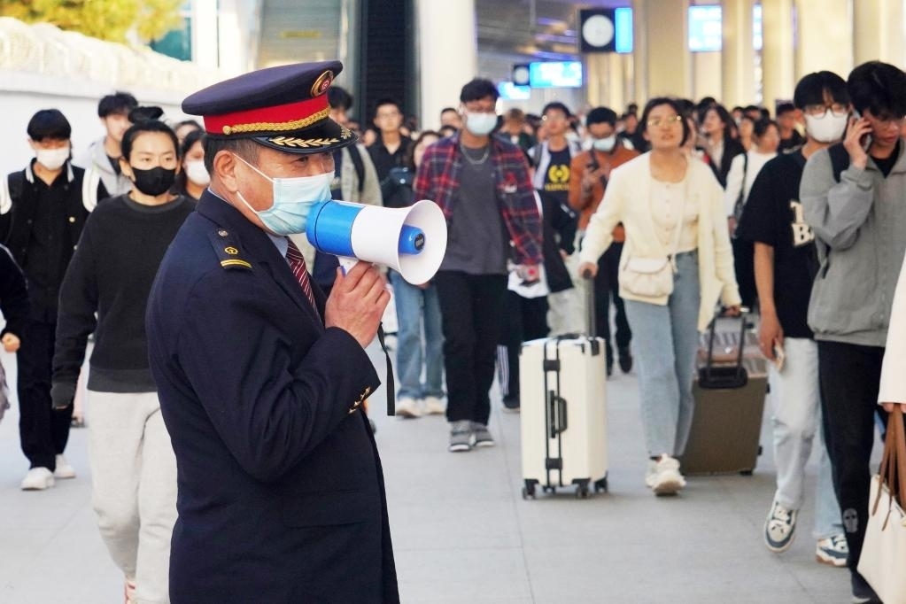 淄博火車站工作人員在引導(dǎo)出站旅客。新華社發(fā)(劉炳友 攝)