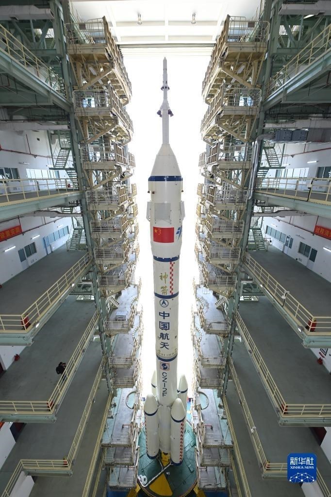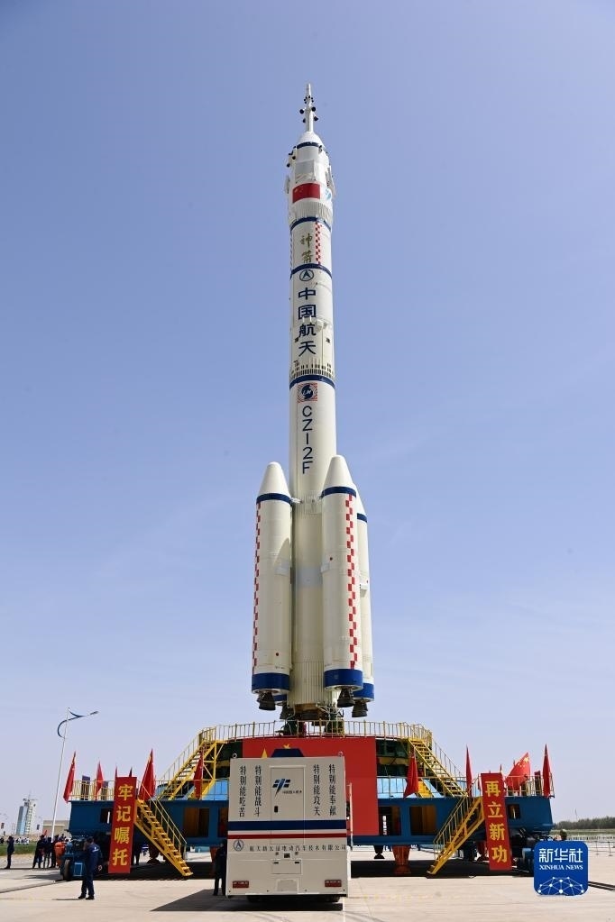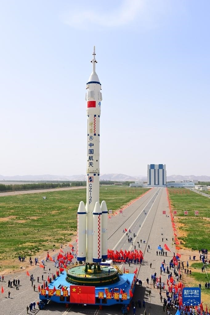 5月22日,神舟十六號載人飛船與長征二號F遙十六運(yùn)載火箭組合體轉(zhuǎn)運(yùn)至發(fā)射塔架。新華社發(fā)(汪江波 攝)
