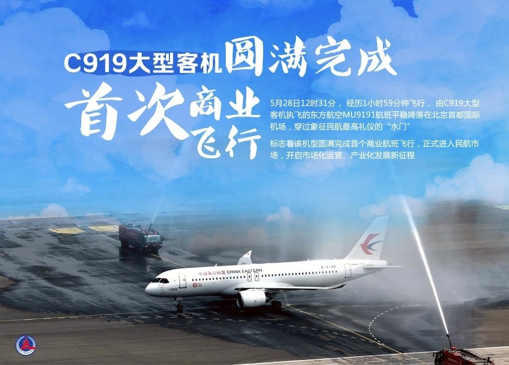 5月28日12時(shí)31分,經(jīng)歷1小時(shí)59分鐘飛行,由C919大型客機(jī)執(zhí)飛的東方航空MU9191航班平穩(wěn)降落在北京首都國(guó)際機(jī)場(chǎng),穿過(guò)象征民航最高禮儀的“水門(mén)”,標(biāo)志著該機(jī)型圓滿完成首個(gè)商業(yè)航班飛行,正式進(jìn)入民航市場(chǎng),開(kāi)啟市場(chǎng)化運(yùn)營(yíng)、產(chǎn)業(yè)化發(fā)展新征程。新華社發(fā)