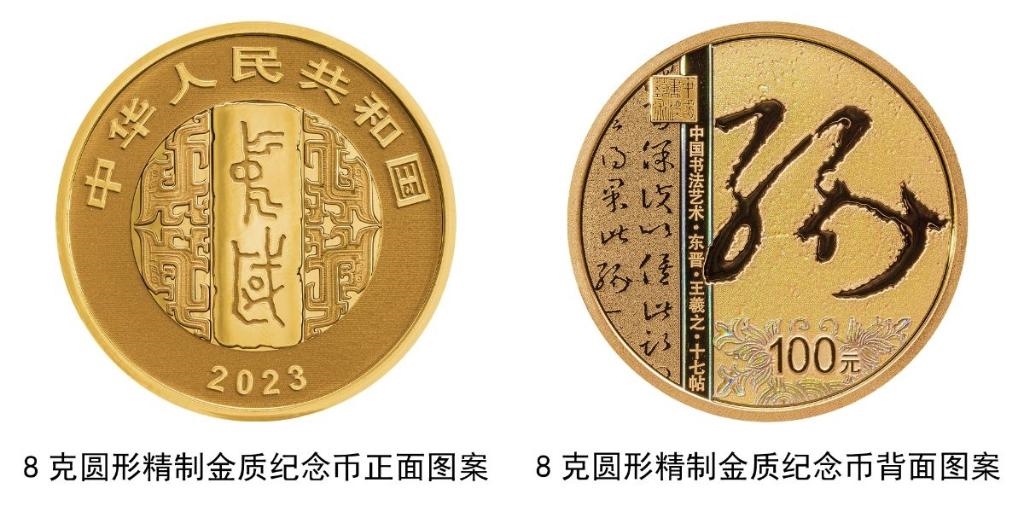 8克圓形金質(zhì)紀(jì)念幣背面圖案為東晉王羲之書《十七帖》局部文字及“緣”字樣與裝飾紋樣、“中國書法藝術(shù)”篆刻鈐印等組合設(shè)計(jì),并刊“中國書法藝術(shù)·東晉·王羲之·十七帖”字樣及面額。