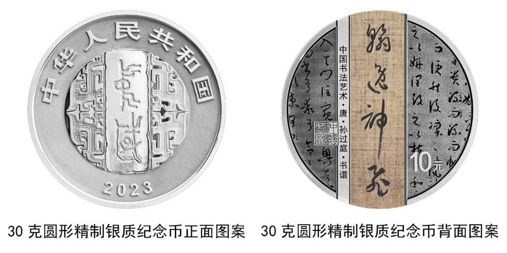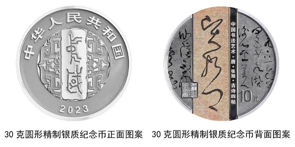 30克圓形銀質(zhì)紀(jì)念幣背面圖案為唐代張旭書《古詩四帖》局部文字及“賢哲”字樣與“中國書法藝術(shù)”篆刻鈐印等組合設(shè)計(jì),并刊“中國書法藝術(shù)·唐·張旭·古詩四帖”字樣及面額。