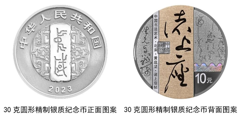 30克圓形銀質(zhì)紀(jì)念幣背面圖案為北宋黃庭堅(jiān)書《諸上座帖》局部文字及“諸上座”字樣與筆架、“中國書法藝術(shù)”篆刻鈐印等組合設(shè)計(jì),并刊“中國書法藝術(shù)·北宋·黃庭堅(jiān)·諸上座帖”字樣及面額。