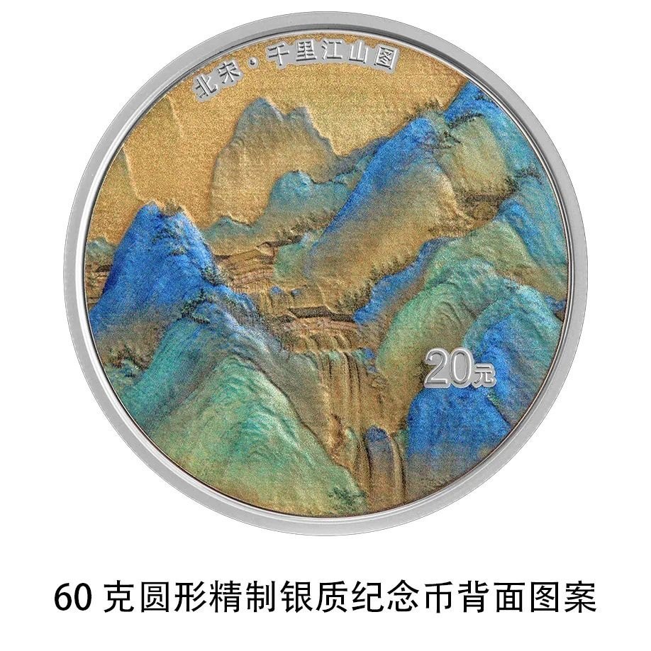 該套金銀紀念幣背面圖案均為《千里江山圖》局部場景,并刊“北宋·千里江山圖”字樣及面額。