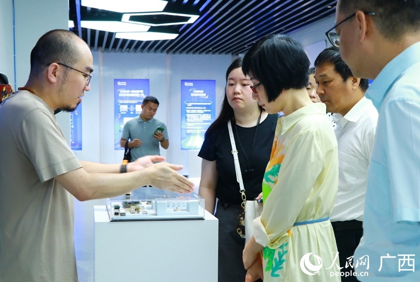 采訪團在西部陸海新通道南寧國際鐵路港展廳內(nèi)采訪。人民網(wǎng) 嚴(yán)立政攝