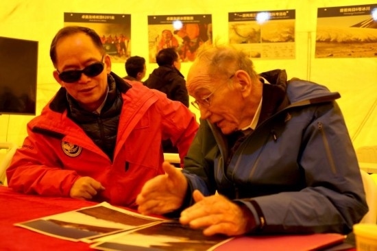 湯普森(右)、姚檀棟(左)在察看普若崗日冰原6號(hào)冰川冰穹A作業(yè)點(diǎn)返回營(yíng)地后討論冰芯鉆取情況。新華社記者劉詩平 攝