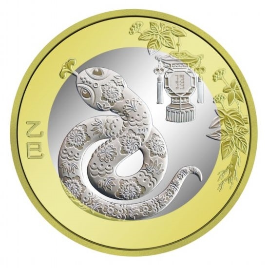 背面圖案方面,雙色銅合金紀(jì)念幣背面圖案為中國(guó)傳統(tǒng)剪紙藝術(shù)與裝飾年畫(huà)元素相結(jié)合的蛇形象,襯以花燈和人參圖案,幣面左側(cè)刊“乙巳”字樣。