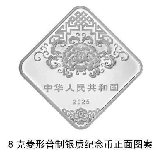 8克菱形銀質(zhì)紀(jì)念幣背面圖案為貼“?!弊謭?chǎng)景,并刊面額。