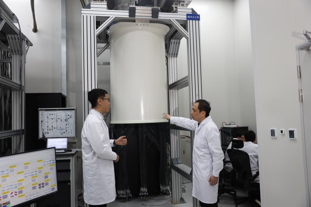 3月3日,中國科學(xué)技術(shù)大學(xué)教授、“祖沖之號(hào)”量子計(jì)算總師朱曉波(右)與學(xué)生討論制冷機(jī)狀態(tài)。新華社發(fā)(代蕊攝)