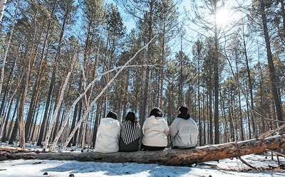 小雨和朋友在北極村的森林里游玩。