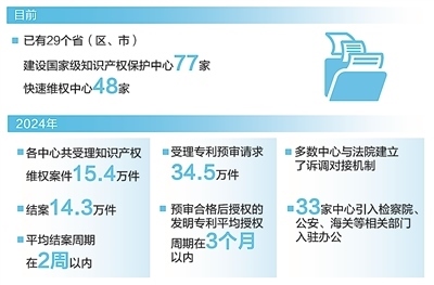 保護(hù)知識(shí)產(chǎn)權(quán)就是保護(hù)創(chuàng)新。中共中央、國(guó)務(wù)院印發(fā)的《知識(shí)產(chǎn)權(quán)強(qiáng)國(guó)建設(shè)綱要(2021—2035年)》提出,“建立完善知識(shí)產(chǎn)權(quán)仲裁、調(diào)解、公證、鑒定和維權(quán)援助體系”。目前,已有29個(gè)?。▍^(qū)、市)建設(shè)國(guó)家級(jí)知識(shí)產(chǎn)權(quán)保護(hù)中心77家、快速維權(quán)中心48家。