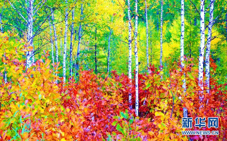 一陣秋風(fēng)吹過(guò),松樹(shù)、白樺、柞樹(shù)齊抖葉片,一叢深、一叢淺,綠葉點(diǎn)點(diǎn)映著黃葉,層林盡染,似一幅幅鋪天蓋地潑彩的油畫(huà)。(9月28日攝)新華網(wǎng)發(fā)(欒維敬 攝)