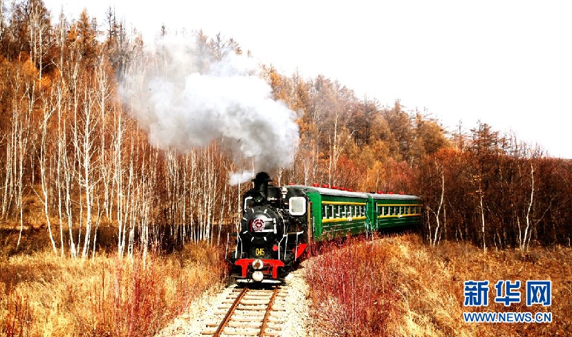金秋時(shí)節(jié),在內(nèi)蒙古大興安嶺阿里河國(guó)家森林公園內(nèi),森林蒸汽機(jī)小火車(chē)帶領(lǐng)游客穿越秋季美景。(9月28日攝)新華網(wǎng)發(fā)(欒維敬 攝)