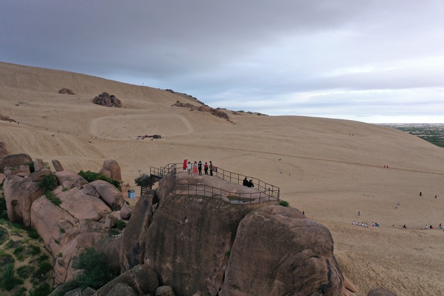 7月31日,雨后的玉龍沙湖空氣清新,游客在玉龍沙湖景區(qū)越野穿沙、騎駱駝游玩,欣賞沙海奇觀。