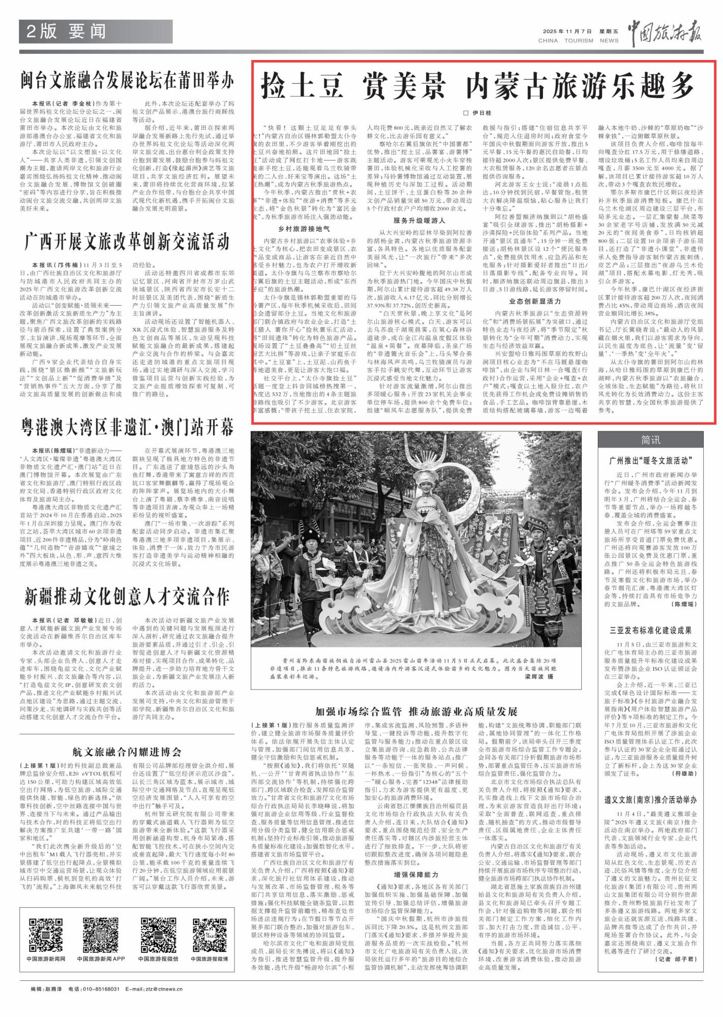 2025年11月7日《中國旅游報(bào)》第2版刊發(fā)了《撿土豆 賞美景 內(nèi)蒙古旅游樂趣多》的文章,報(bào)道了今年秋季,內(nèi)蒙古推出“賞秋+農(nóng)事”“非遺+體驗(yàn)”“夜游+消費(fèi)”等多元業(yè)態(tài),將“金色秋景”轉(zhuǎn)化為“富民金流”,為秋季旅游市場(chǎng)注入強(qiáng)勁動(dòng)能。