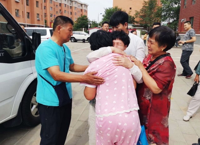當(dāng)一行人下車后看到,迎接他們的李曉霞親人和包頭社會救助站的工作人員時都很激動,李曉霞與家人團聚相擁而泣時,在場的每一個人都感動不已。
