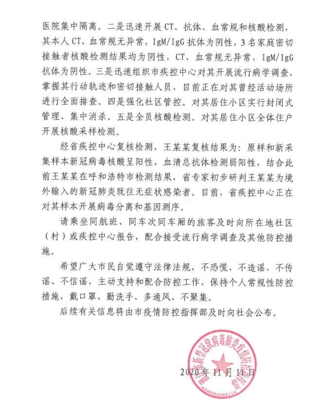 11月10日王某在潛江市核酸檢測結(jié)果陽性。為切實保障廣大市民身體健康,呼和浩特市疫情防控指揮部已對王某離呼前的密切接觸者和密切接觸者的密切接觸者全部落實了管控措施,后續(xù)工作按照相關(guān)要求正在有序進行中。