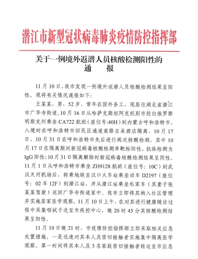 2020年11月11日,網(wǎng)絡(luò)多家媒體轉(zhuǎn)載湖北省潛江市新冠肺炎防控指揮部發(fā)布的題為“關(guān)于一例境外入潛人員核酸檢測陽性的通報”,內(nèi)容涉及一名入境人員在呼和浩特市集中隔離醫(yī)學(xué)觀察后返鄂后被診斷為新冠肺炎無癥狀感染者相關(guān)內(nèi)容。經(jīng)核查,相關(guān)情況公告如下: