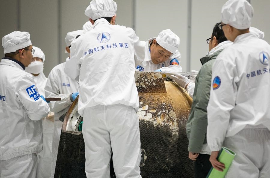 2020年12月17日,在中國航天科技集團(tuán)五院,科研人員打開嫦娥五號返回器艙門,取出裝有月球樣品的容器并進(jìn)行稱重。新華社記者金立旺攝