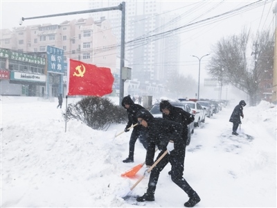 鐵路街道轄區(qū),12輛小鏟車、4輛大鏟車的發(fā)動機(jī)滾燙,全體街居干部、物業(yè)公司、保潔大隊(duì),派出所和交警大隊(duì)等部門人員幾十人凍得手腳發(fā)麻也沒有放下手中的雪鏟,暴風(fēng)雪中,他們第一時(shí)間守在清雪保暢通的前沿陣地,“我們的目標(biāo)是‘雪停路凈’,一定要保障好群眾的安全出行。”