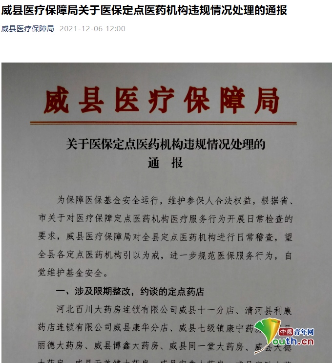 中國青年網(wǎng)邢臺12月8日電 (記者 姜文山)2021年12月6日河北省威縣醫(yī)療保障局官方微信公眾號發(fā)布《威縣醫(yī)療保障局關(guān)于醫(yī)保定點(diǎn)醫(yī)療機(jī)構(gòu)違規(guī)情況處理的通報》顯示。河北威縣醫(yī)療保障局在進(jìn)行日?;闄z查中發(fā)現(xiàn),63家定點(diǎn)藥店被通報整改、暫停結(jié)算、約談負(fù)責(zé)人等處理。包括威縣人民醫(yī)院、威縣中醫(yī)院、威縣婦幼保健計劃生育服務(wù)中學(xué)在內(nèi)的36家定點(diǎn)醫(yī)療機(jī)構(gòu)被通報。